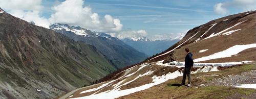 Tobias beskådar utsikten vid Col du Glandon, en av passen som skulle vara stängda, ser ju farbart ut.