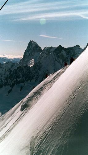 Kabinbanan upp på Aiguille du Midi var en spännande färd, den sista biten var mycket brant. I bildens övre vänstra hörn syns en av säkerhetslinorna för kabinbanan.